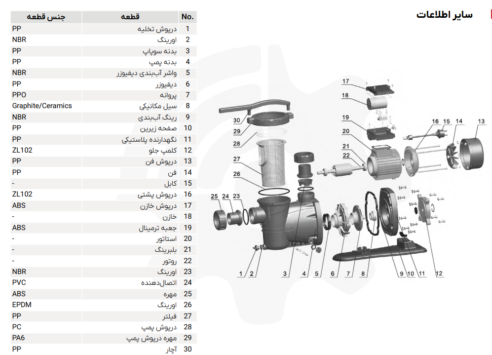 • بدنه پمپ: پلی‌پروپیلن تقویت‌شده با فایبرگلاس (مقاوم در برابر کلر و خوردگی)